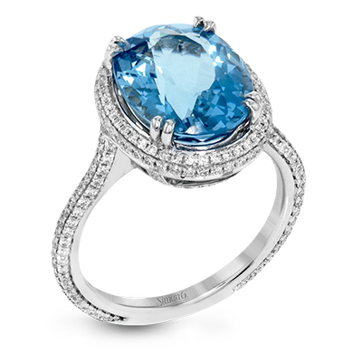 This remarkable 18k white gold ring contains .72 ctw white diamonds with a stunning 4.80 ct oval aquamarine center stone.