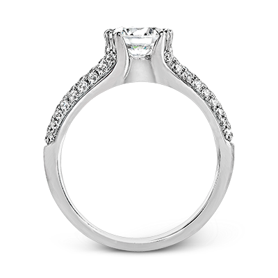 a modern take on a classic design, this white gold engagement ring is accented by .35 ctw of round cut white diamonds.