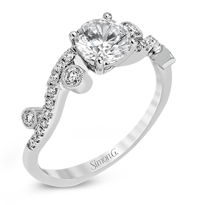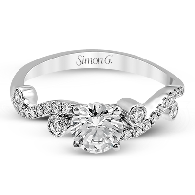 Playful and modern, this white gold wedding set sparkles with .31 ctw of round white diamonds highlighting the center stone.
