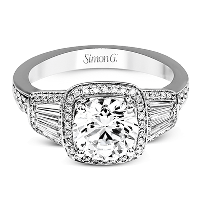 Modern Halo Diamond Engagement Ring in White Gold with Baguette Accents