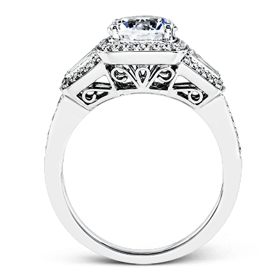 This design is a modern take on a classic design, with .29 ctw of round diamonds set into its halo and sides, and .31 ctw of baguette diamonds flanking the center stone.