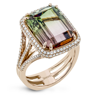 This remarkable 18k rose gold ring features a beautiful 8.69 ct watermelon tourmaline stone in the center.