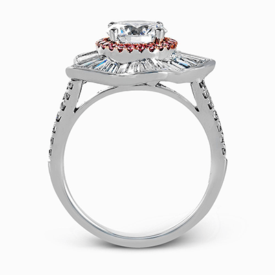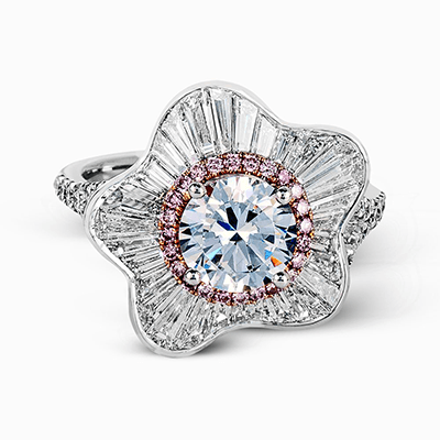 this modern white gold ring features an eye-catching floral design set with .19 ctw of round cut white diamonds complemented by .13 ctw pink diamond accents and 1.23 ctw of baguette cut diamonds.