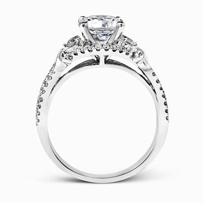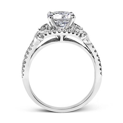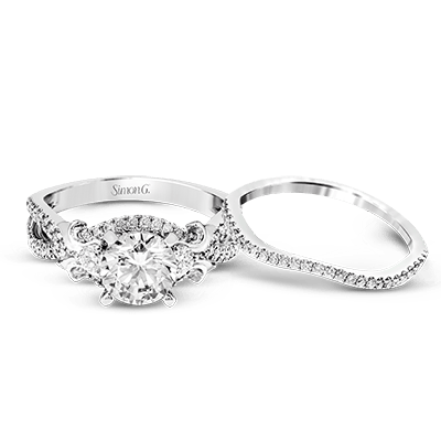 featuring a delicately twisted shank, this brilliant white gold engagement ring and complimentary wedding band are set with .55 ctw of round cut white diamonds.