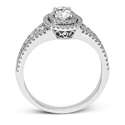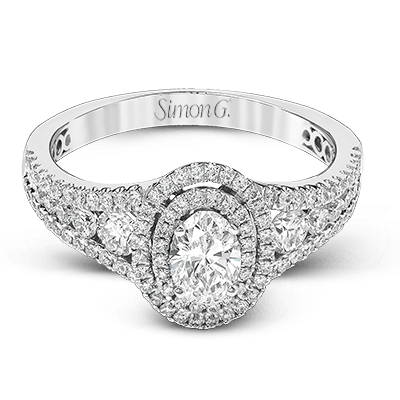 featuring an exquisite contemporary design, this white gold engagement ring features an eye-catching oval double halo complemented by .68 ctw of round cut white diamonds.