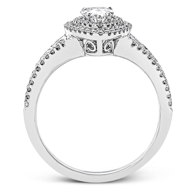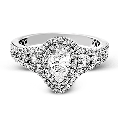 Featuring a pear-shaped double halo, this modern white gold engagement ring is highlighted by .68 ctw of round cut white diamonds.