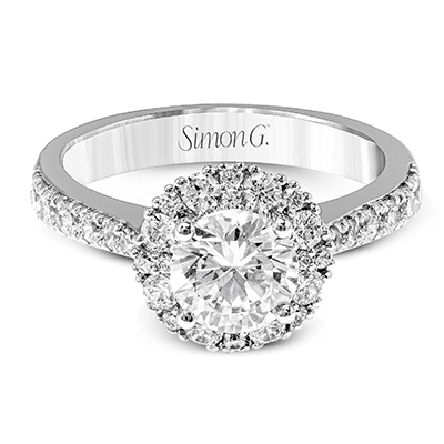 This gorgeous white gold engagement ring's clean yet romantic design features .60 ctw of round white diamond accents.