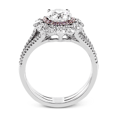 this lovely white gold contemporary ring features a dazzling halo of .10 ctw pink diamonds accented by 1.13 ctw round cut white diamonds.