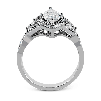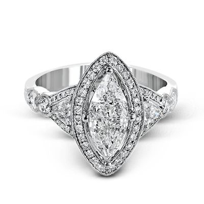 This gorgeous 18k white gold engagement ring setting features a marquise shaped halo, two trillion-shaped side stones totally .23 ctw and two marquise side diamonds totaling 17 ctw.these are surroundied by .29 ctw of smaller round diamonds.