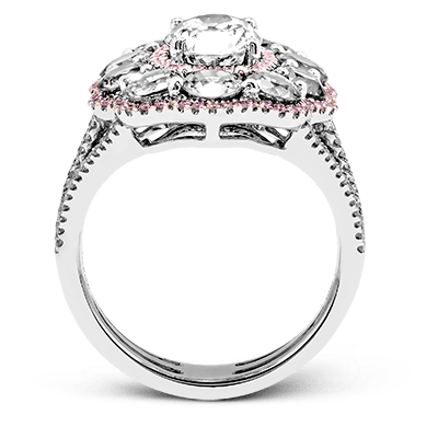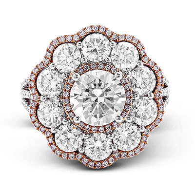 the dramatic floral cluster design of this white and rose gold vintage-inspired ring is set with 2.45 ctw round cut white diamonds and .21 ctw pink diamonds.