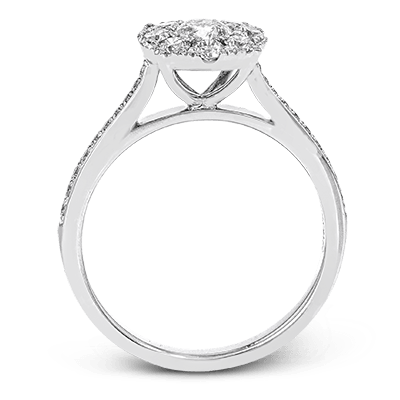 This delightful ring is crafted from 18k white gold and features a .30 ct white diamond in the center of .50 ctw of smaller round white diamonds.