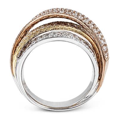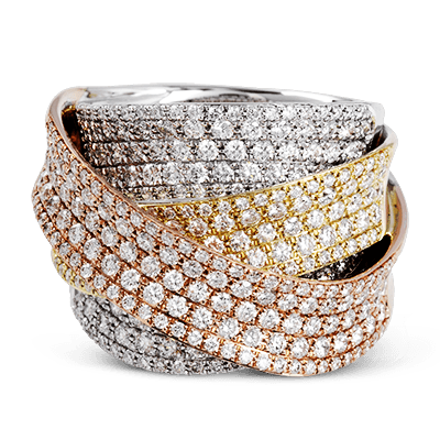 This statement ring is formed from 18k gold in three different tones- yellow, white and rose. the overlapping design is pave set with an astounding 2.94 ctw of sparkling white round brilliant diamonds.