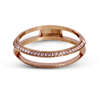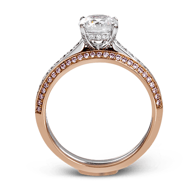 An exquisite statement, this engagement ring features .23 ctw of white diamonds in 18k white gold through the center, bordered by .25 ctw on pink diamonds set into 18k rose gold.
