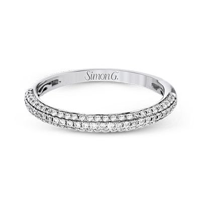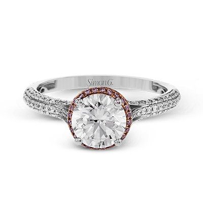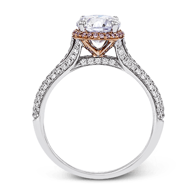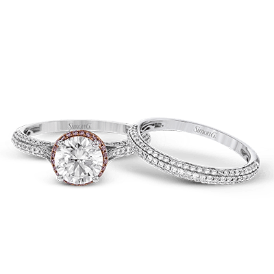 Modern and sculptural, this wedding set is crafted from 18k white and rose gold and contains .54 ctw of white diamonds and .08 ctw of pink diamonds.