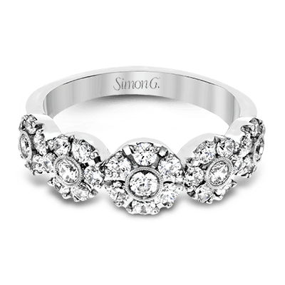 This whimsical white gold ring features .78 ctw of round white diamonds accentuated by .07 ctw of round pink diamonds as well as rose gold details in a playful floral design.