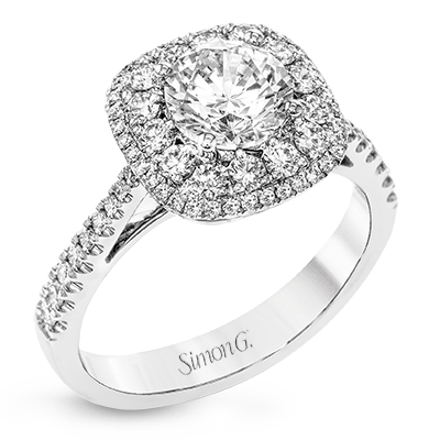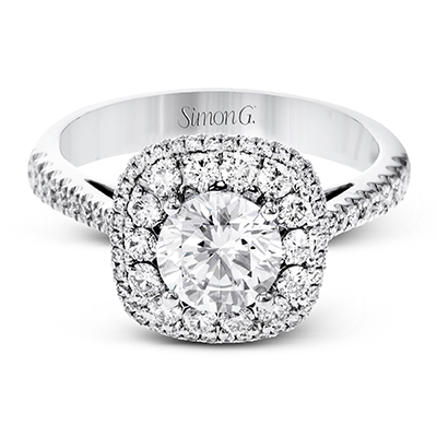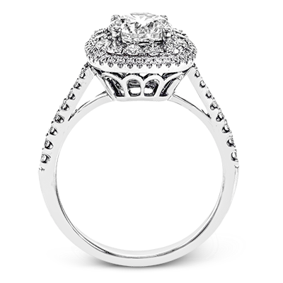 This 18k white gold engagement ring setting has a stunning double halo design set with .61 ctw of shining white round brilliant diamonds.