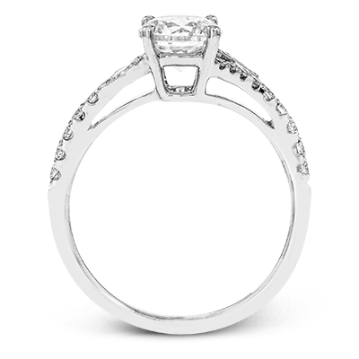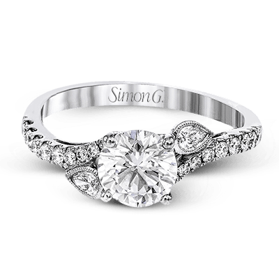 This lovely 18k white gold engagement ring contains .20 ctw of white round brilliant diamonds, highlighted by .10 pear shaped white diamonds.