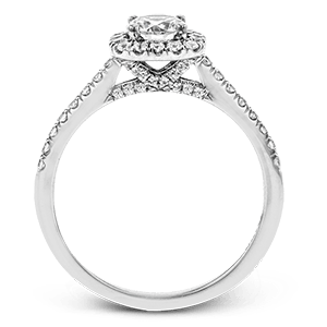 This beautiful white gold ring's halo and shank are set with .34 ctw of round white diamond accents.