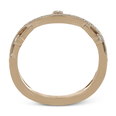 This 18k rose gold band has a design of in intertwined lines of pave set and bezel set diamonds that create a distinctive look.