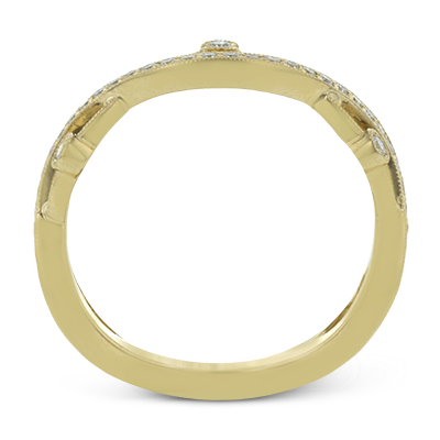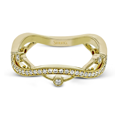 This 18k yellow gold band has a design of in intertwined lines of pave set and bezel set diamonds, which creates a distinctive look.