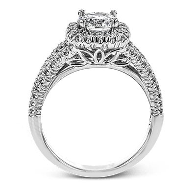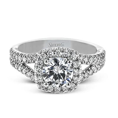 This elegant, contemporary design in white gold sparkles with .45 ctw of round white diamonds in its halo and split shank.