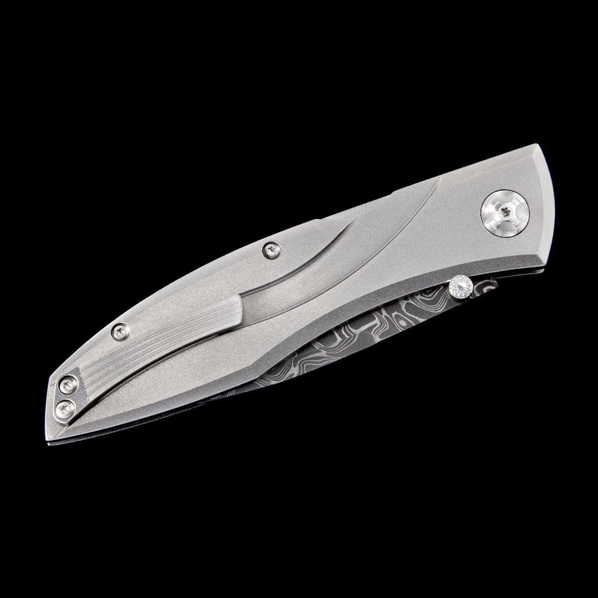 The Omni 'Stratus' features a frame in aerospace-grade titanium. The blade is hand-forged 'Intrepid' damascus by Chad Nichols.