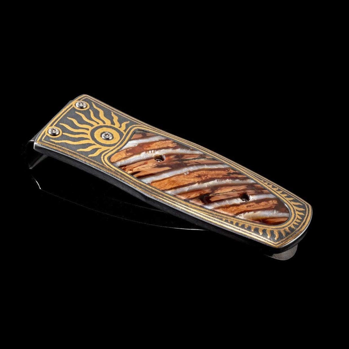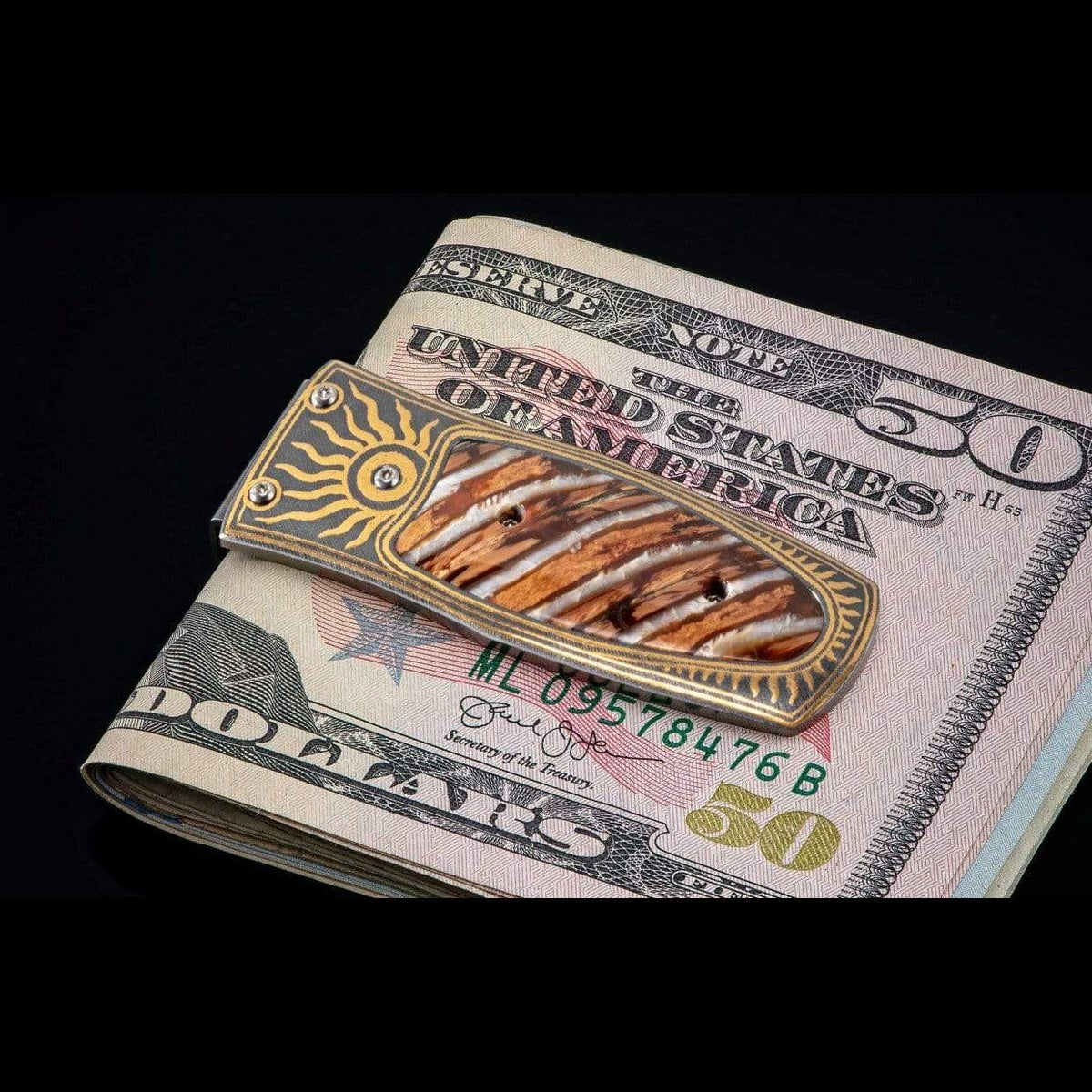The Pharaoh ‘Star Burst’ features a frame featuring a frame in 24K gold koftgari (the ancient Indian art of inlaying gold or sterling silver in tool steel), and a 10,000-year-old fossil Woolly Mammoth tooth inlaid. The clip is machined and blast-polished from tempered stainless steel, with a beautiful engraving bright cut against the matte-finished background.