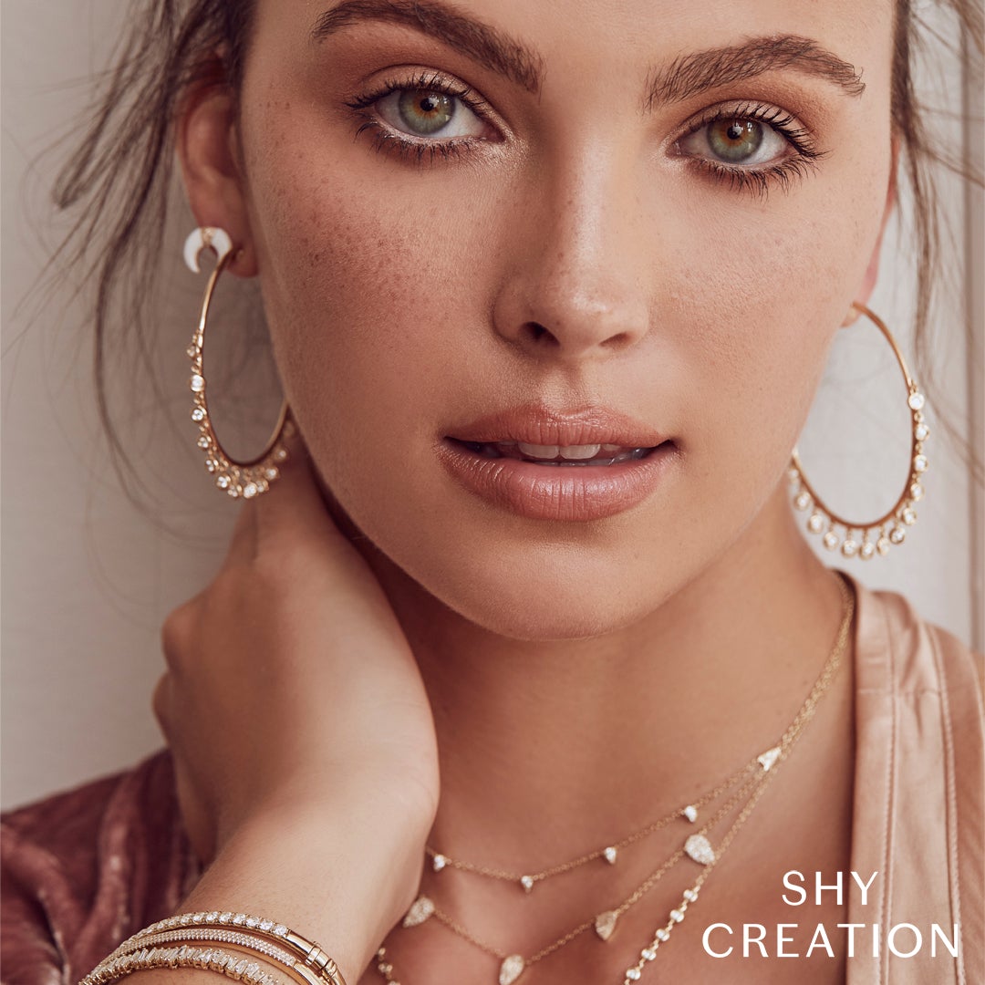 Fall in love with in Shy Creation's medium size 'Celia' shaker hoop earrings. These high polish hoops are adorned with fifteen bezel set diamond charms that 'shake' as you move.