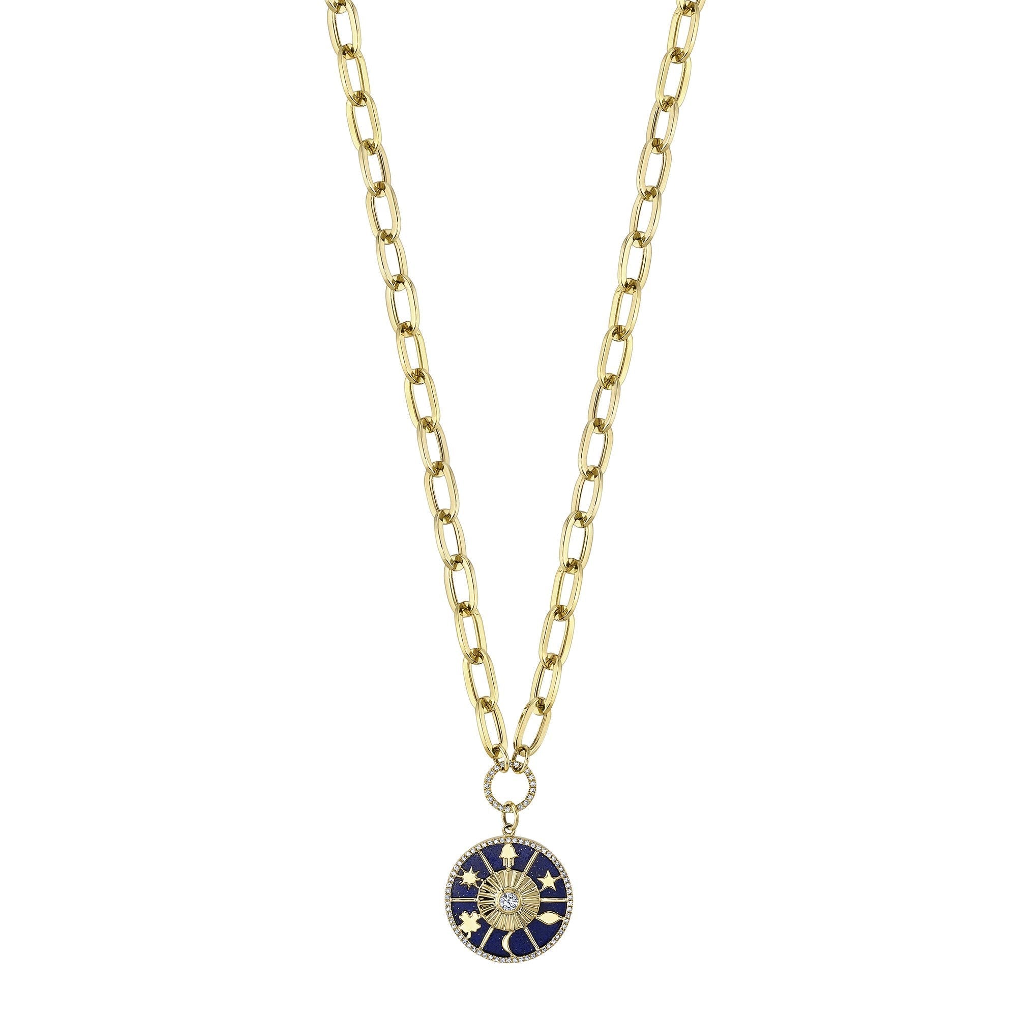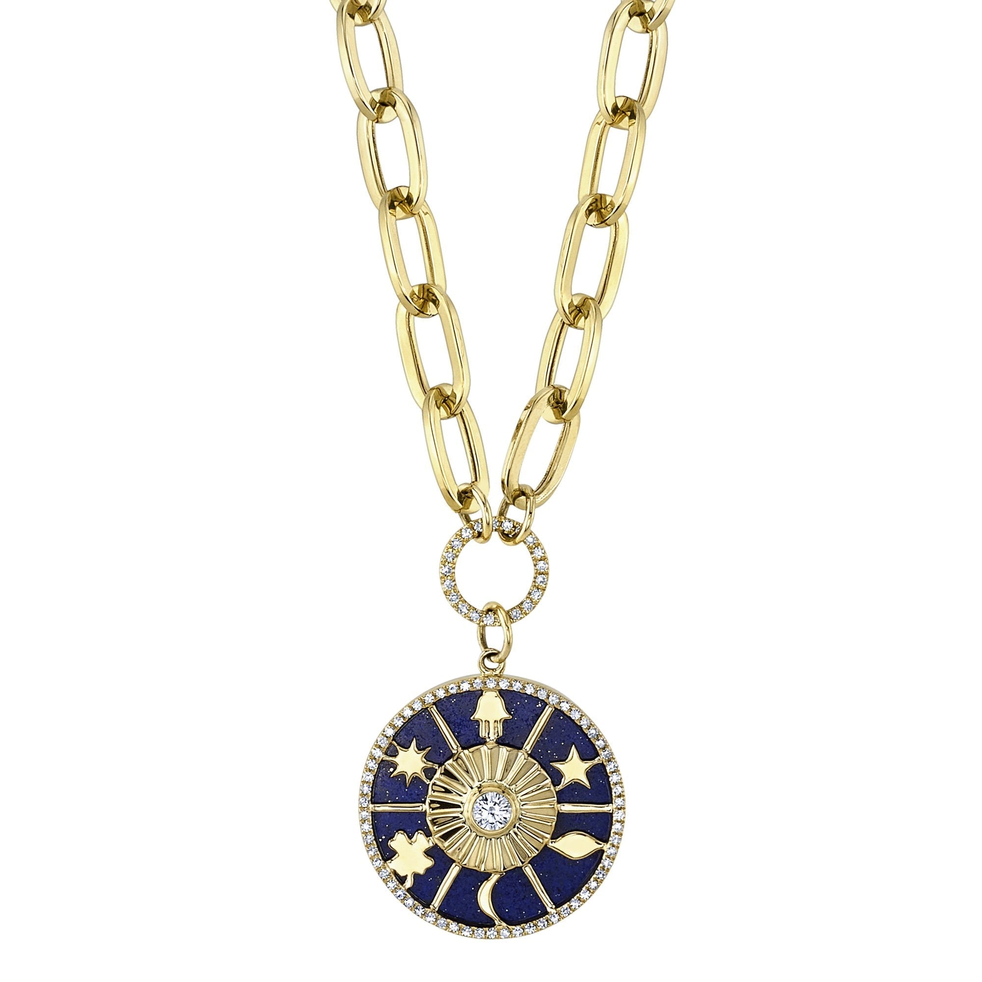 0.24CT DIAMOND & 4.43CT LAPIS CLOVER, HAMSA, MOON, STAR & SUN PAPER CLIP LINK NECKLACE