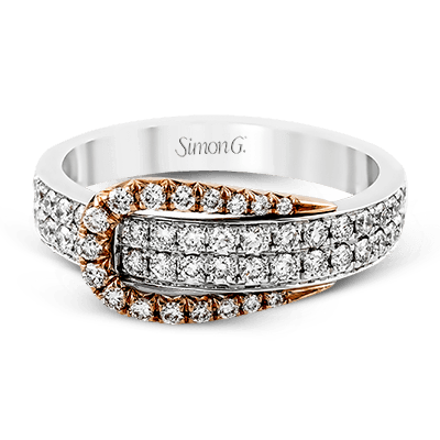 The eye-catching buckle design of this contemporary white and rose gold ring is highlighted by .65 ctw of round cut white diamonds.