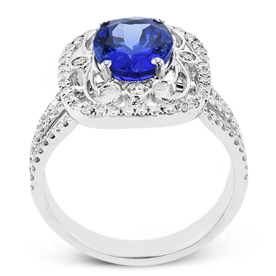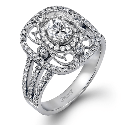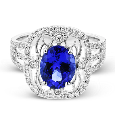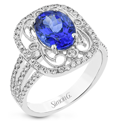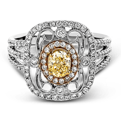 Reflecting an intricate vintage-inspired design, this three-tone gold ring is set with .61 ctw round cut white diamonds and a .53 ctw yellow oval diamond.