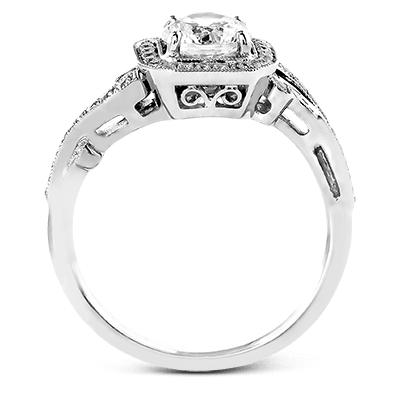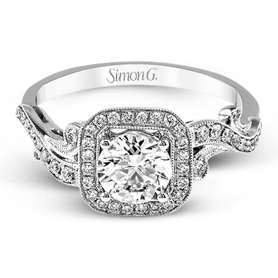 Featuring an elegant design, this white gold classic engagement ring is accented with .25 ctw round cut white diamonds.