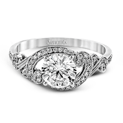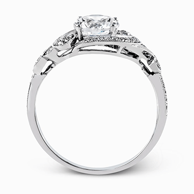 This lovely modern white gold engagement ring features a memorable halo and is accentuated by .19 ctw glistening round cut white diamonds.