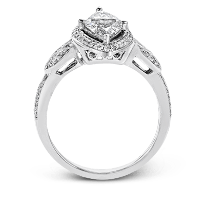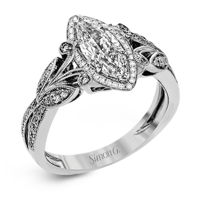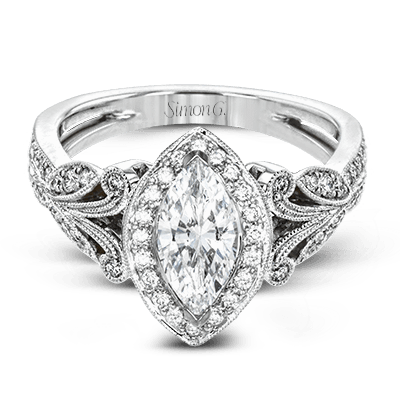 This amazing 18k white gold engagement ring features vintage-inspired design elements set with .28 ctw of white diamonds.