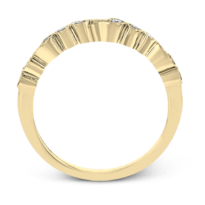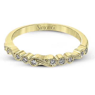 This vintage inspired 18k yellow gold ring contains .12 ctw of round white diamonds in a delicate swirling design. perfect for stacking.