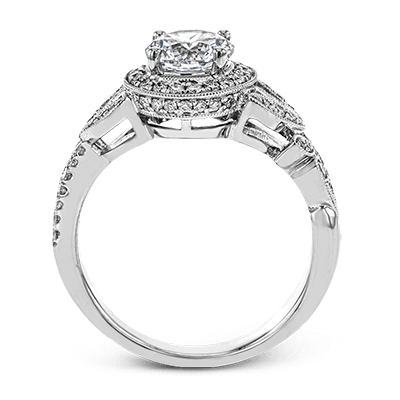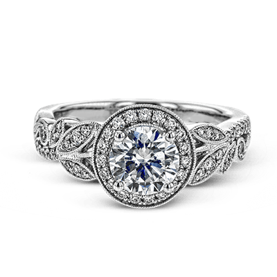 The stunning nature-inspired design of this white gold engagement ring features lovely milgrain edging and a total of .34 ctw of round white diamond accents.