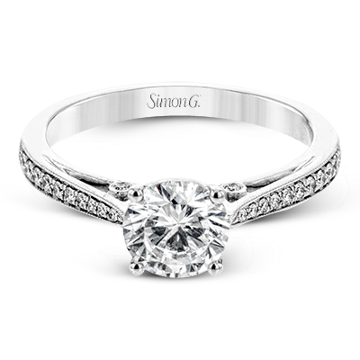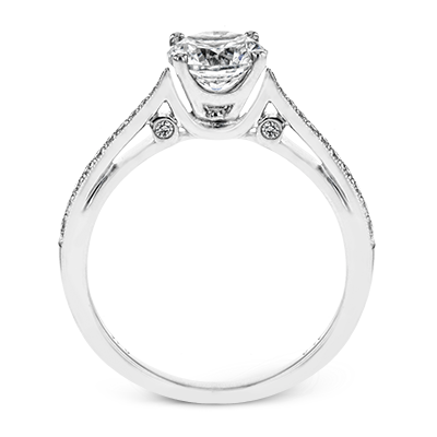 Sleek and lovely, this white gold engagement ring has an elegant design enhanced with .14 ctw of round white diamonds.