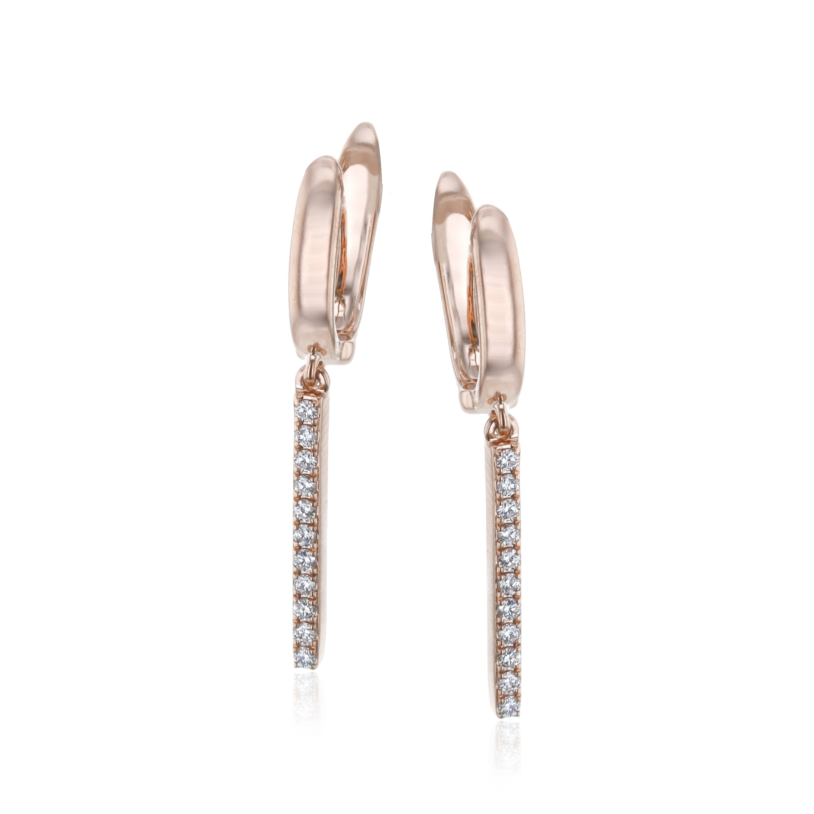 These elegant drop earrings feature sleek hoops with a slender vertical bar of sparkling diamonds suspended below. Available in white, rose, and yellow metal finishes, they offer a modern yet timeless look that transitions effortlessly from day to evening wear.