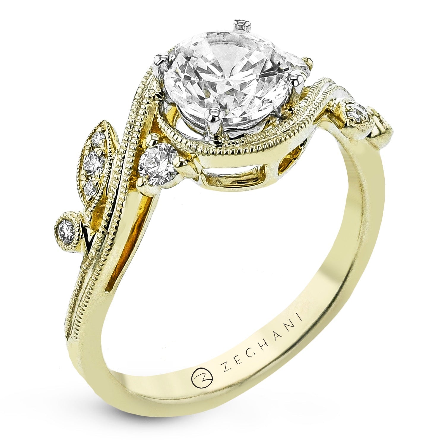 This vintage-inspired ring features a round brilliant center diamond accented by bezel-set and prong-set side diamonds in a flowing, nature-inspired design. Delicate milgrain detailing along the white gold band adds timeless charm and intricate elegance.